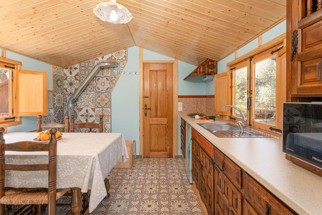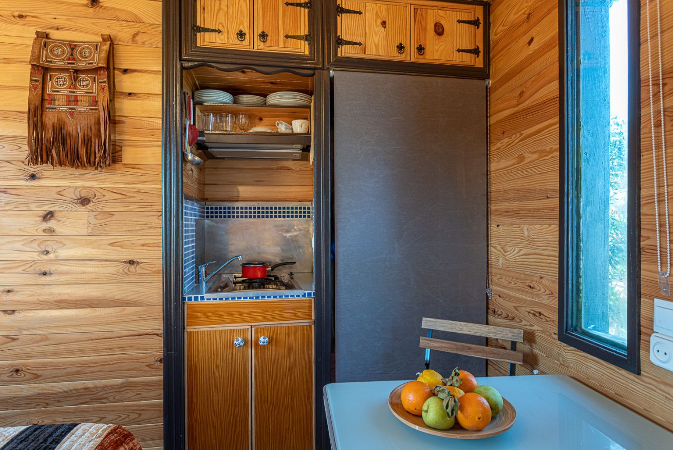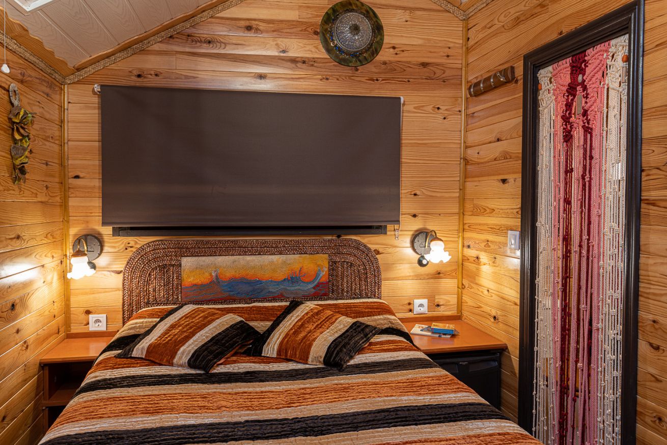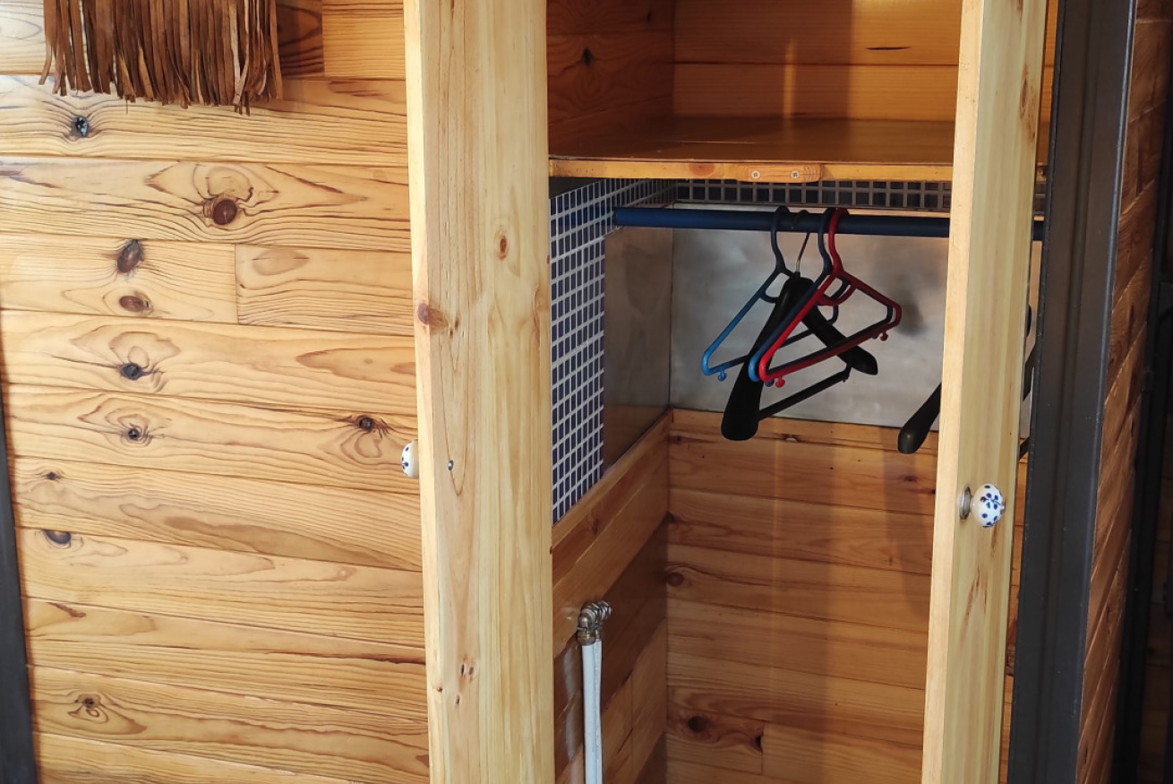 The tree house is made up of two 9m2 cabins, each one very well used. The first space is the bedroom with bathroom above the tree, where you will find a double bed that is a large storage room for luggage, also two single bunk beds and a wardrobe, a bathroom with shower, sink, toilet and a minibar fridge. The second space is the kitchen-dining room. It is located under the tree and has a gas stove, fridge, hob, microwave, wood stove and at the back of the cabin a barbecue area.