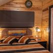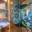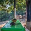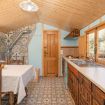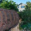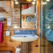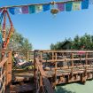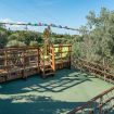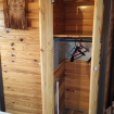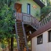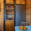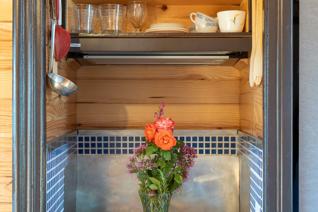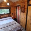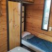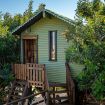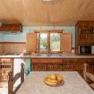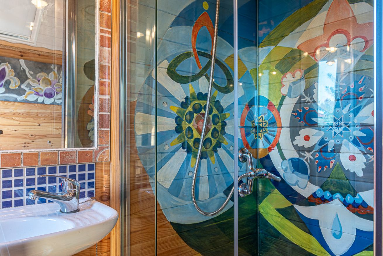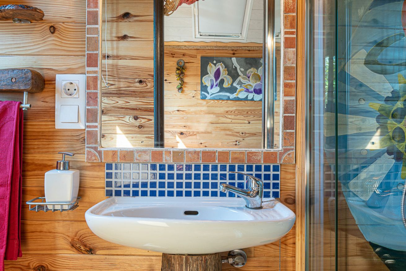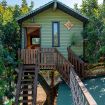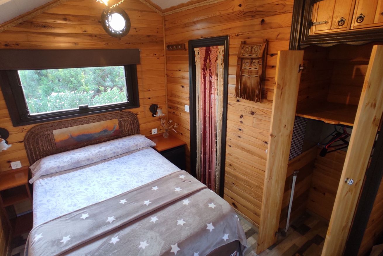 The tree house is made up of two 9m2 cabins, each one very well used. The first space is the bedroom with bathroom above the tree, where you will find a double bed that is a large storage room for luggage, also two single bunk beds and a wardrobe, a bathroom with shower, sink, toilet and a minibar fridge. The second space is the kitchen-dining room. It is located under the tree and has a gas stove, fridge, hob, microwave, wood stove and at the back of the cabin a barbecue area.